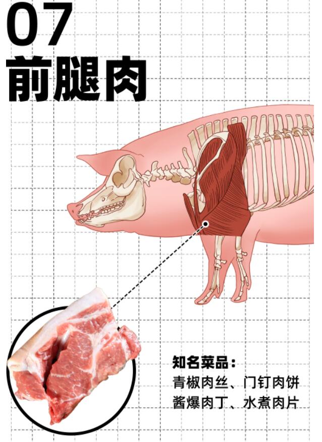 猪前腿也叫前夹肉,整体脂肪和筋膜比后腿多,操作难度和健康程度都逊色于后腿。